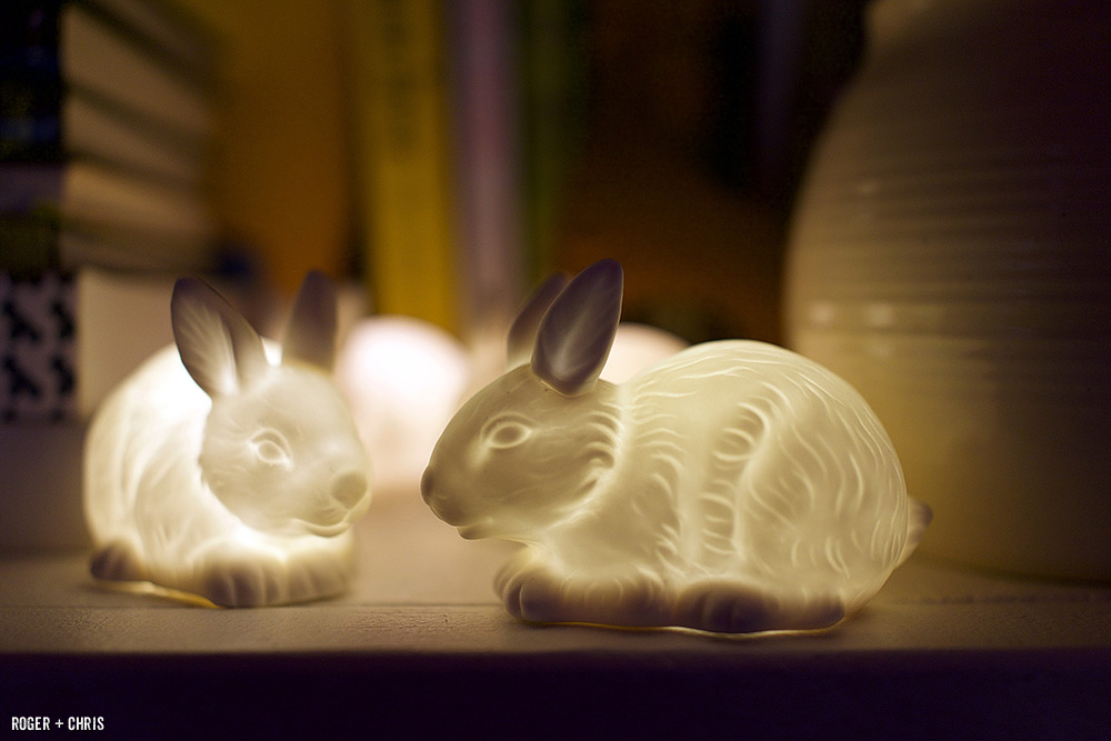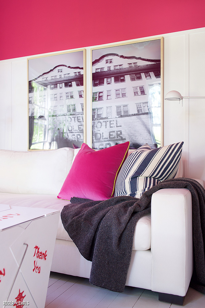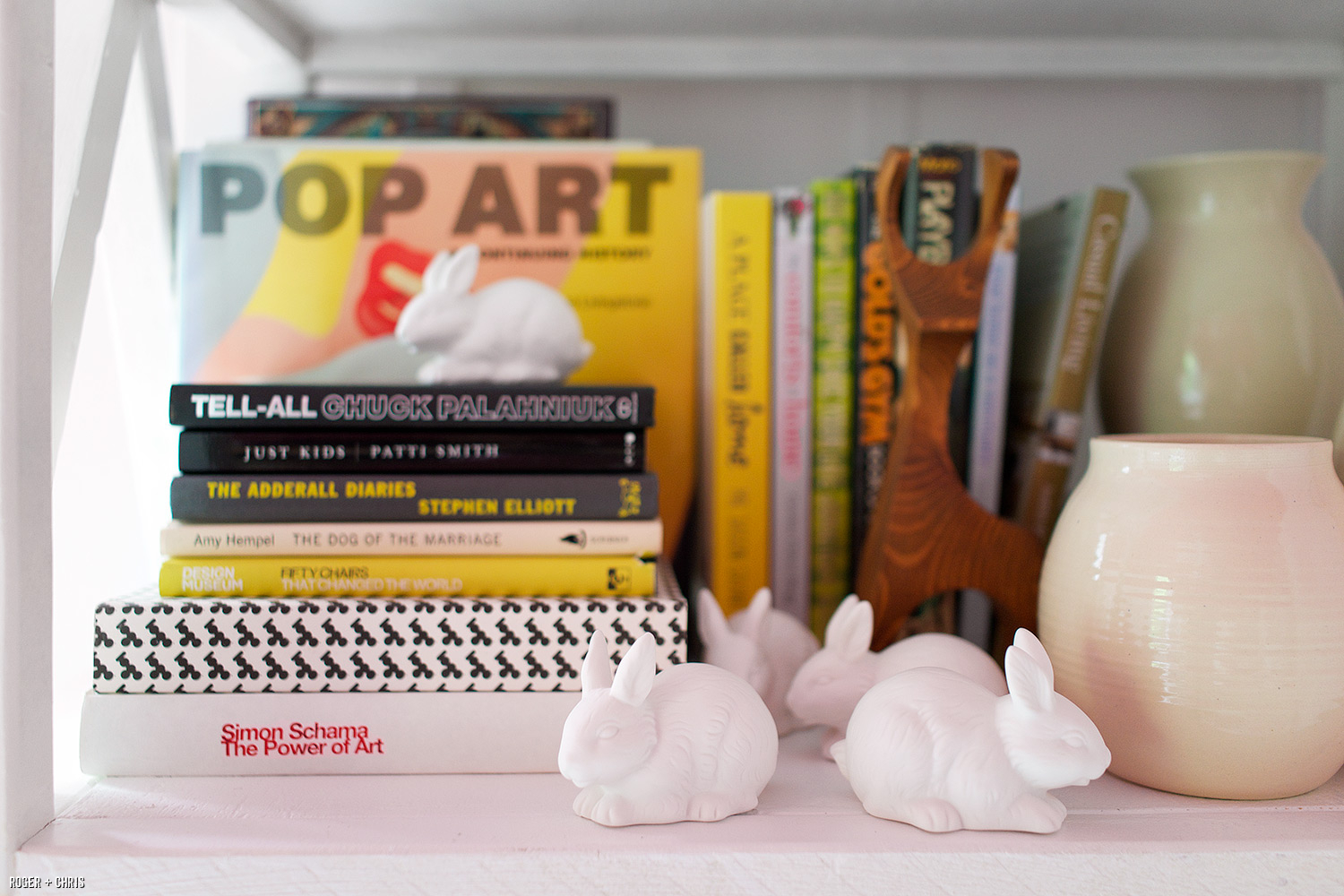 Chris' poster-sized black-and-white photographs depict one of our historic spa village's abandoned hotels (which, coincidentally, is visible from the room). Roger found fuchsia velvet pillows with chartreuse welting, combining them with a few neutral throws during winter months. We arranged the bookshelf with art books, novels, our pottery, a Bowers & Wilkins Zeppelin stereo connected to our home system via Apple's AirPlay, and some adorable porcelain bunny nightlights. Oh, and a skull. No...not a real one.