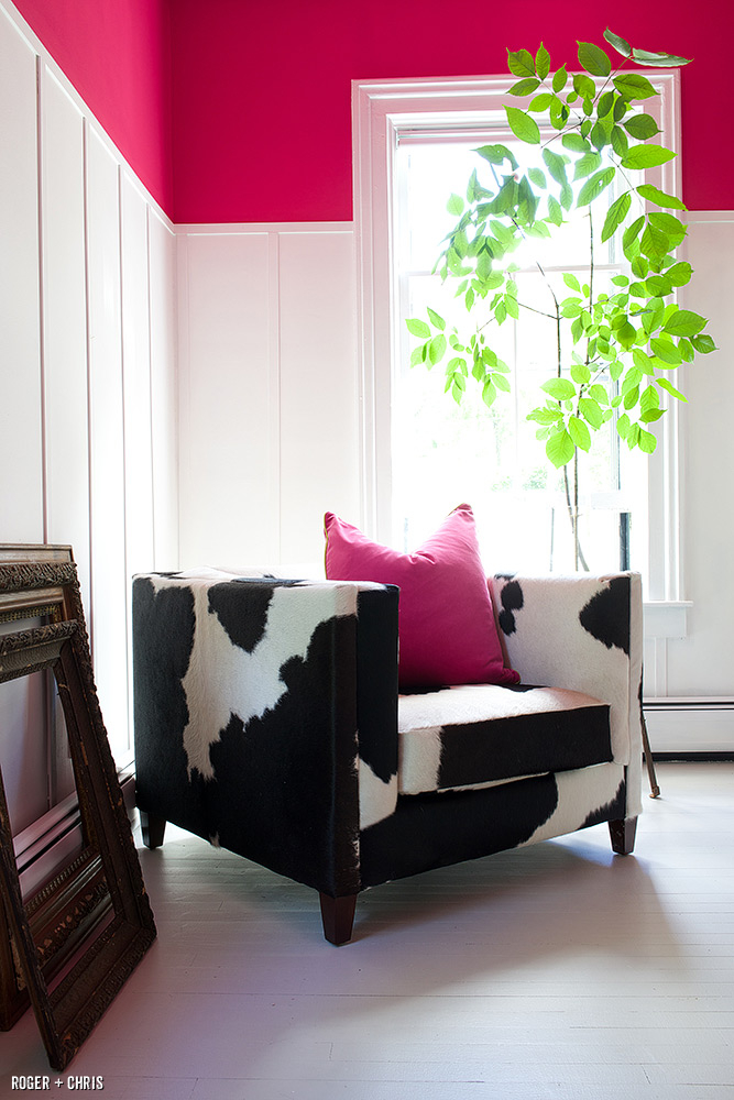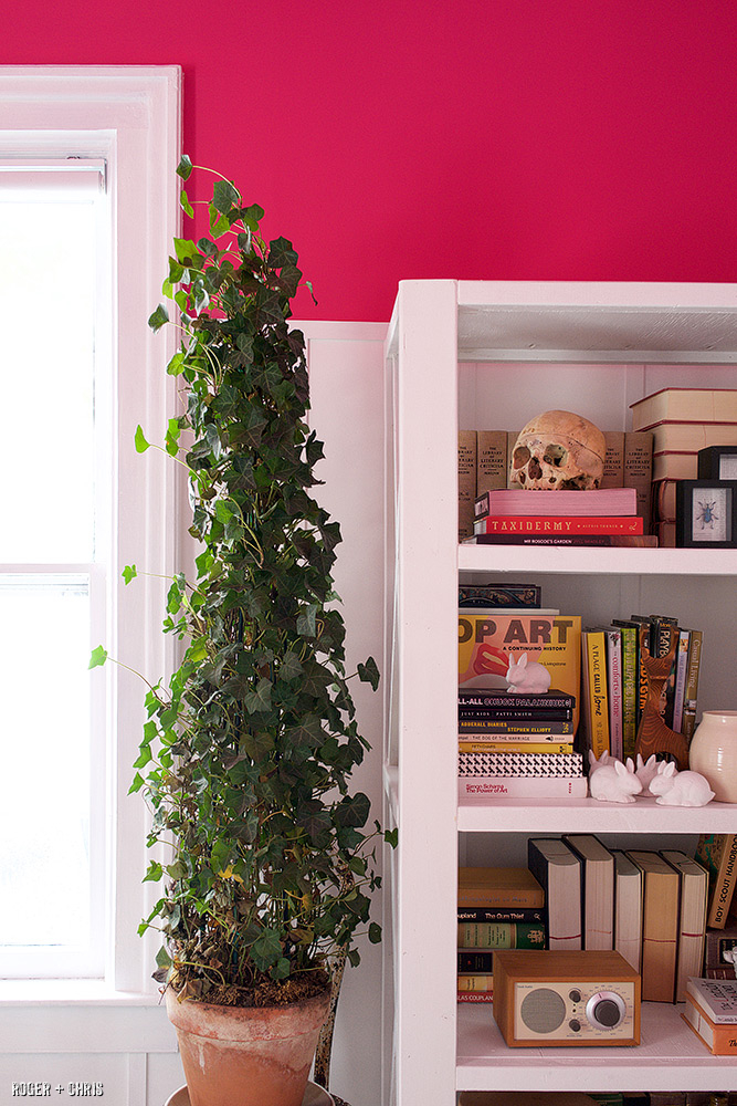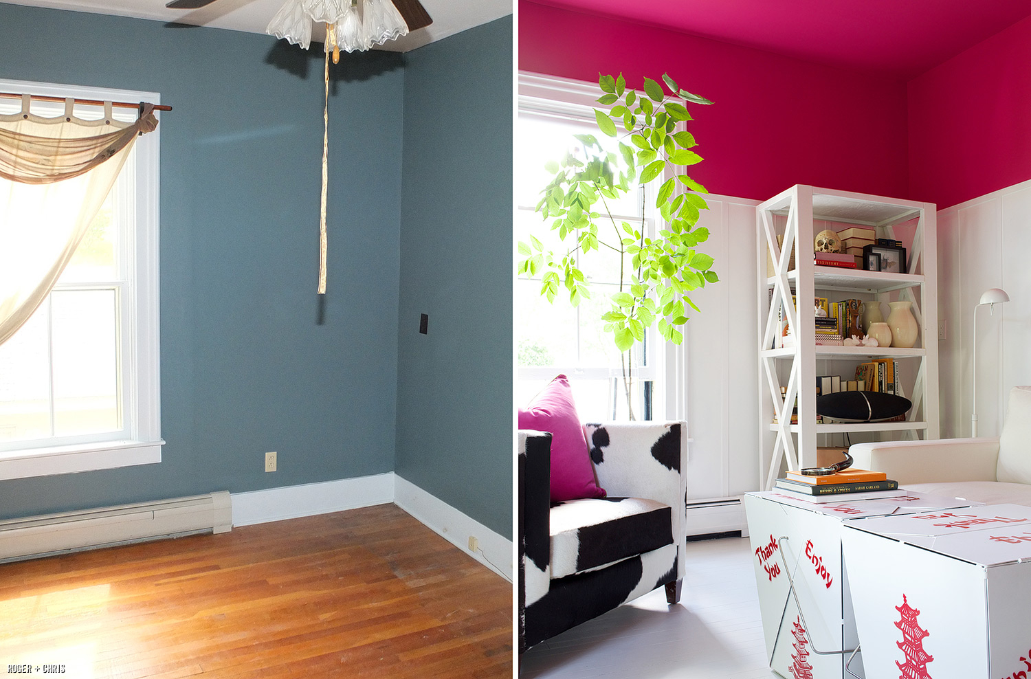 Our color palette for the study would use a few tricks to enhance the space. First, we were treating the ceiling as a wall, applying Benjamin Moore's bold Peony to it. The walls, trim, and baseboard heaters would all be painted in Sherwin-Williams' High-Reflective White. Because nothing in our house is level, painting the ceiling fuchsia and the walls white would have highlighted the wavy and sloping lines of the ceiling. By dropping the ceiling color down to the upper walls, we were able to disguise this and improve the appearance of the room dramatically.