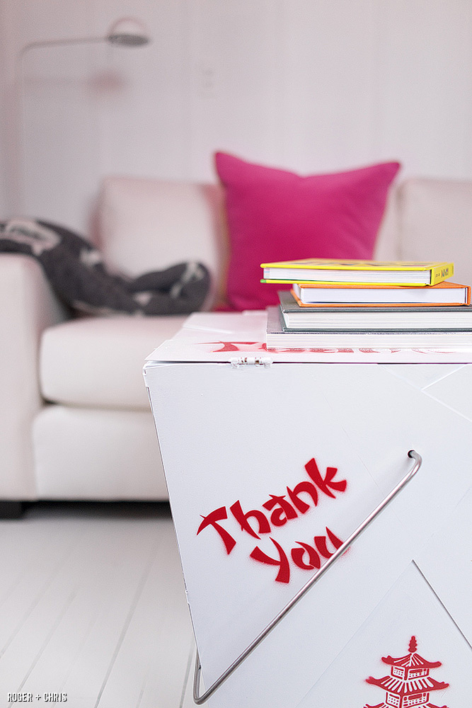 A simple metal desk and file cabinet offer a more traditional work surface and storage space. For more storage, we used two of our laser-cut steel Takeout Tables. They work as coffee tables and laptop stands, but have ample storage space inside for everything from fabric swatches to digital doodads. And they're just a little bit fun.