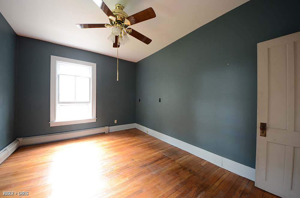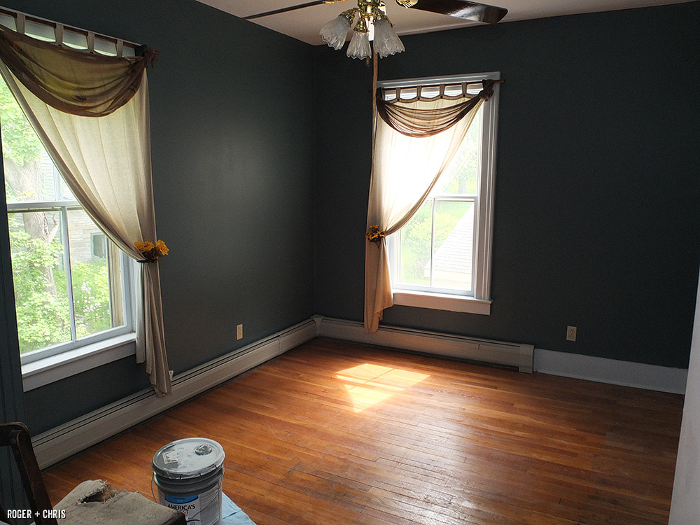 The paint scheme included bluish charcoal walls, blue-grey window and baseboard trim, a dingy white ceiling, a tan door, and taupe baseboard heaters. Yes, that's five colors in a small room, none of which actually worked with one another. The wood floors were spotted with water stains and an add-on closet consumed more floorspace than it provided in utility. Rough walls, cracked and peeling paint, and some truly hideous granny drapes finished it off.