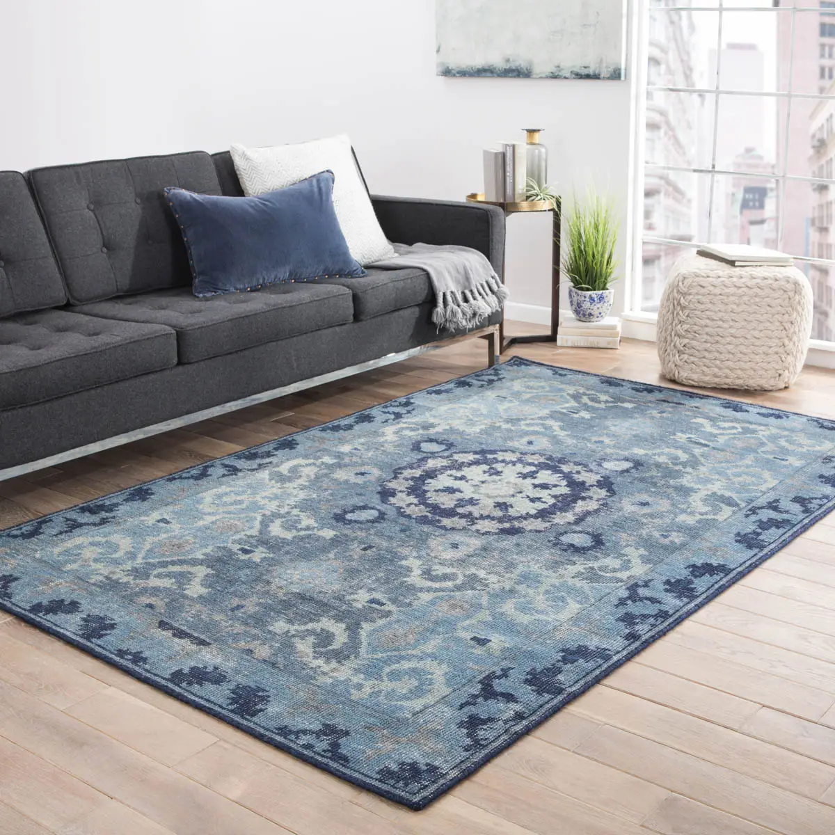 Exceptionally made and artfully designed, this hand-knotted area rug infuses contemporary homes with vintage allure. This wool accent boasts an elegant center medallion and scrolling details for a worldly dose of style. Deep blue, denim, and gray hues offer a moody, cool-toned look to the timeless design.