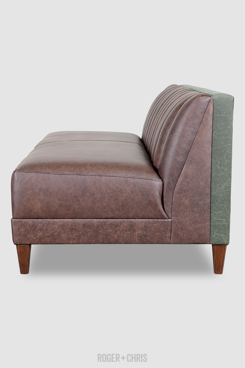 Harley channel-tufted armless sofa in Saloon Dark Brown leather and Martexin Olive waxed canvas