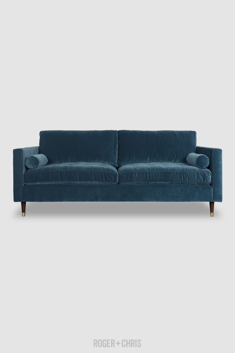 86" Natalie sofa in Como Bali blue velvet with bolster pillows and brass-capped legs